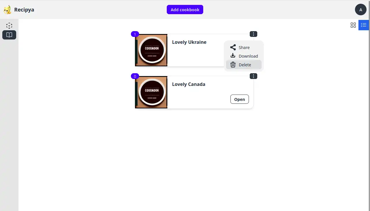 To delete a cookbook from your collection, first click the three vertical dots at the top right of the cookbook you wish to delete. Then, click the Delete submenu item. You will be prompted whether you want to proceed before deletion.