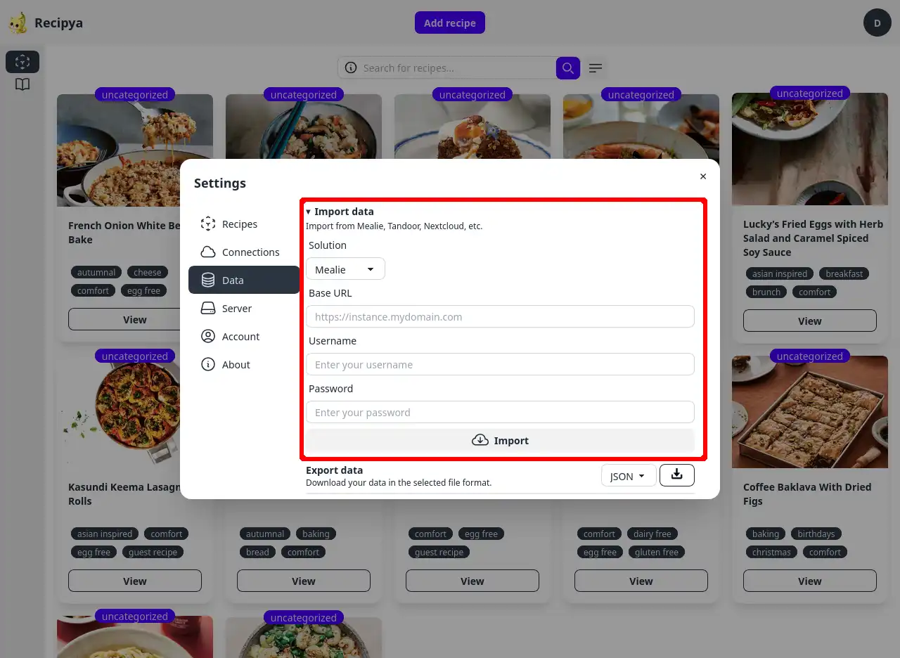 Suivez ces étapes pour importer vos recettes depuis une instance Mealie :